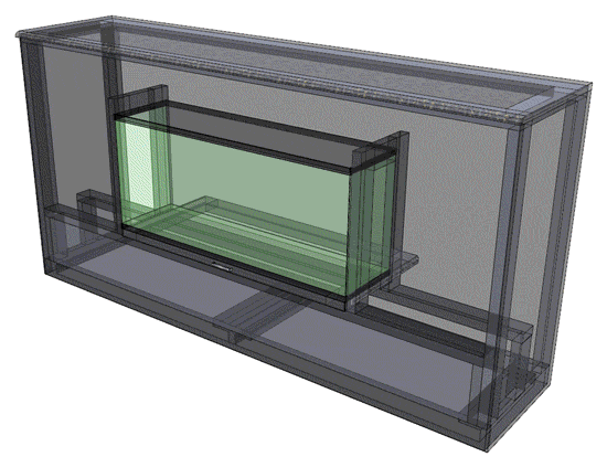 Animation displaying the design & supporting structure of a wall mounted vivarium. Custom parts included the all-glass vertical conversion kit, a modified aquarium with hidden forced ventilation, and the support structure for the vivarium itself.