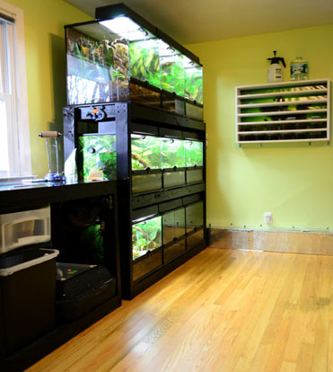 An incredibly simple, inexpensive, utility rack holding 9 Exo Terra vivariums, an incubator, and a drawer for storage. Racks like these can be designed and built in just a few hours. They aren't necessarily pretty, but a great solution for breeders or enthusiasts on a budget.