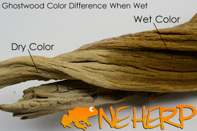 A fairly light, dense, extremely detailed wood that's on the higher-end of price, but also offers the most dramatically detailed pieces. Performs well in dry, humid, and wet conditions; and is probably one of the best looking vivarium wood types out there. Dry ghostwood is a deep tan color, but when moistened it turns to a darker shade of brown as shown in this picture. This wood is the most sought-after type we offer here at NEHERP, as it's very difficult to source at reasonable prices! Also great for custom backgrounds.