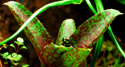 (Most commonly used in Dart Frog habitats)A commonly used plant species worth mentioning for their special care instructions are Neoregelias. The axils of these water-holding plants are often utilized by many different species as a breeding or egg deposition site. (Neoregelias aren't used as often with larger species, due to the spines running down the leaves.) Neoregelias and other Bromeliads should be mounted epiphytically (without soil), up high, on backgrounds and/or on other pieces of raised decor, when kept in a humid environment. If kept in an enclosure where humidity will average much below 80%, these can be mounted in backgrounds, kept in net pots with a fast-draining soil. (Ex: 50% NEHERP Substrate + 50% orchid bark) Bromeliads absorb water & nutrients through their leaves, with their roots used mostly for support. The roots can be either removed or left on (depending on your personal preference); but the plant's base should not generally be wrapped in moss, sphagnum, or other slow-draining substrates unless kept in a fairly dry environment. Otherwise, wrapping the roots/base of a Neoregelia, or planting it in substrate can/will lead to the plant rotting in a vivarium. The easiest way to mount a Neoregelia is to insert the remainder of it's stolon (essentially the "hard stem piece") into a hole, whenever possible. This can be achieved by drilling a hole into the wood, background, or other decor you are using. For added support, the stolon can be hot glued in place. If your plant's stolon is too short, or a hole isn't available, Neoregelias can be mounted using floral wire, orchid monofilament line, or even toothpicks. (Trim excess wire, line, and wood)