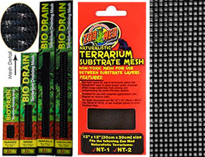 Above the drainage layer (below the substrate) is the screen separator; a non-toxic fine screen mesh that allows air & water to pass through it. The purpose of the screen separator is to keep the substrate from reaching the drainage layer and wicking up water into the substrate. Pre-cut pieces are available online for most common size front opening terrariums, and we've also begun offering custom-cut screen separators for our client's convenience. (With that being said; non-toxic screen material from a hardware store works too!) Weed-blocking material is used by some hobbyists, but be sure it's able to allow springtails to pass through it, to access the drainage layer below for the fastest reproduction.