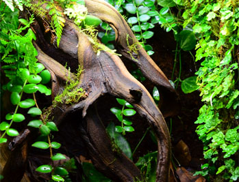 Leaf litter provides a handful of important benefits to a live vivarium, with some more apparant than others. First, it offers a realistic ground cover that provides smaller inhabitants hiding spots within the enclosure. For many shy, smaller inhabitants, these easily accessible cover-spots can make the difference between a shy animal (often fear of being far from cover), and one that is often out in the open. Over time, these leaves will begin to break down in a vivarium, which will provide small amounts of nutrients to the plants, as well as food for the beneficial microfauna. The litter will need to be added-to occasionally, and the time it will last is generally determined by the type of leaf, and a combination of humidity in the enclosure (higher R/H = faster deterioration), microfauna population, and the inhabitant species themselves. There are a handful of different common leaf litter choices used today, with the choice mostly being a matter of preference. One of the most popular ground covers for vivariums is moss, which looks great, is somewhat inexpensive, and is fairly easy to grow. However, a full carpet of bright green moss is not a natural looking choice. Leaf litter covers most tropical & temperate habitats with moss & other plants peeking through occasionally. For the most realistic looking vivarium floor, consider a mixture of moss, leaf litter, and other smaller vines & climbing plants that can peek out here & there. Using small natural accent items is quickly becoming common practice, and gives a vivarium an added touch of realism. Depending on the inhabitant species, we usually add a 1-2in deep leaf litter layer.Decor, Hardscaping, and Wood