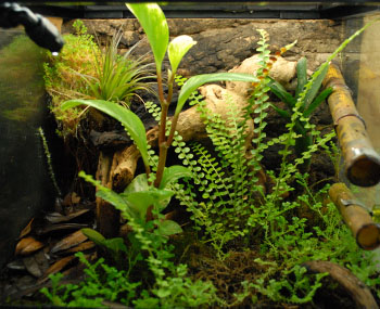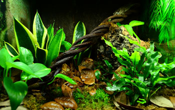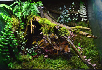 Leaf litter provides a handful of important benefits to a live vivarium, with some more apparant than others. First, it offers a realistic ground cover that provides smaller inhabitants hiding spots within the enclosure. For many shy, smaller inhabitants, these easily accessible cover-spots can make the difference between a shy animal (often fear of being far from cover), and one that is often out in the open. Over time, these leaves will begin to break down in a vivarium, which will provide small amounts of nutrients to the plants, as well as food for the beneficial microfauna. The litter will need to be added-to occasionally, and the time it will last is generally determined by the type of leaf, and a combination of humidity in the enclosure (higher R/H = faster deterioration), microfauna population, and the inhabitant species themselves. There are a handful of different common leaf litter choices used today, with the choice mostly being a matter of preference. One of the most popular ground covers for vivariums is moss, which looks great, is somewhat inexpensive, and is fairly easy to grow. However, a full carpet of bright green moss is not a natural looking choice. Leaf litter covers most tropical & temperate habitats with moss & other plants peeking through occasionally. For the most realistic looking vivarium floor, consider a mixture of moss, leaf litter, and other smaller vines & climbing plants that can peek out here & there. Using small natural accent items is quickly becoming common practice, and gives a vivarium an added touch of realism. Depending on the inhabitant species, we usually add a 1-2in deep leaf litter layer.Decor, Hardscaping, and Wood