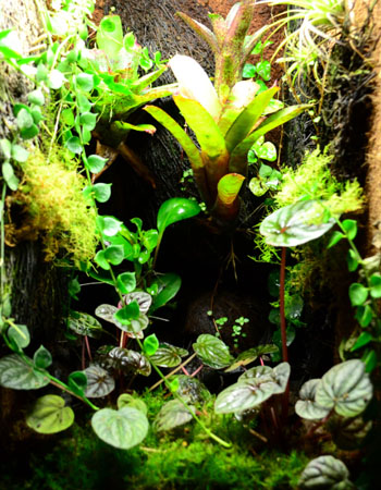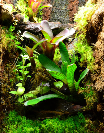 (Most commonly used in Dart Frog habitats)A commonly used plant species worth mentioning for their special care instructions are Neoregelias. The axils of these water-holding plants are often utilized by many different species as a breeding or egg deposition site. (Neoregelias aren't used as often with larger species, due to the spines running down the leaves.) Neoregelias and other Bromeliads should be mounted epiphytically (without soil), up high, on backgrounds and/or on other pieces of raised decor, when kept in a humid environment. If kept in an enclosure where humidity will average much below 80%, these can be mounted in backgrounds, kept in net pots with a fast-draining soil. (Ex: 50% NEHERP Substrate + 50% orchid bark) Bromeliads absorb water & nutrients through their leaves, with their roots used mostly for support. The roots can be either removed or left on (depending on your personal preference); but the plant's base should not generally be wrapped in moss, sphagnum, or other slow-draining substrates unless kept in a fairly dry environment. Otherwise, wrapping the roots/base of a Neoregelia, or planting it in substrate can/will lead to the plant rotting in a vivarium. The easiest way to mount a Neoregelia is to insert the remainder of it's stolon (essentially the "hard stem piece") into a hole, whenever possible. This can be achieved by drilling a hole into the wood, background, or other decor you are using. For added support, the stolon can be hot glued in place. If your plant's stolon is too short, or a hole isn't available, Neoregelias can be mounted using floral wire, orchid monofilament line, or even toothpicks. (Trim excess wire, line, and wood)