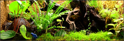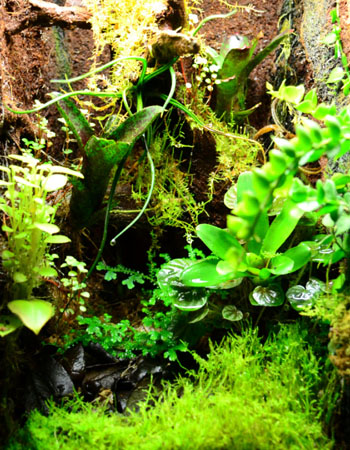 Terrestrial plants should usually be placed in order of height; with the majority of tallest plants behind the shorter ones for the best appearance & visual "flow". This gives your vivarium the illusion of depth, and will minimize the difficulty of upkeep & plant pruning by keeping more area accessible. Plus, it removes the issues of taller plants blocking light from the shorter ones, with (what will look like) a natural height gradient within the habitat. We usually plant our terrestrial plants last; after all the "mountable" plants have already been placed. This keeps your serviceable work area as open as possible until the last step.