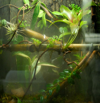 Mounting epiphytic plants (plants that grow out-of-soil) can be done in a number of ways. If you are mounting a rooted portion of a vine or trailing plant, wrap the roots with a small moist ball of either New Zealand Sphagnum Moss, or NEHERP moss before proceeding. If you are mounting a rootless clipping, you can either place the end in substrate, a ball of NZ Sphagnum, or leave it exposed (if humidity is 85%+) to mount it. You can then carefully attach the plant to a background with orchid monofilament line, toothpicks or floral wire. We use floral wire more often than toothpicks & fishing line, but all three have their own advantages & disadvantages. For a close-up example of how to mount plants using florist wire, please see the image in the right column. Be sure to leave no dangerous open-loops with fishing line, and no exposed points with florist wire or toothpicks to protect the vivarium's inhabitants. After a few weeks of acclimation, the plants will begin to throw their own gripping roots on whatever they are resting on, and again the supports will no longer be needed. As previously mentioned, be sure to keep the mount-surface moist during the acclimation period to encourage the roots to grip it!